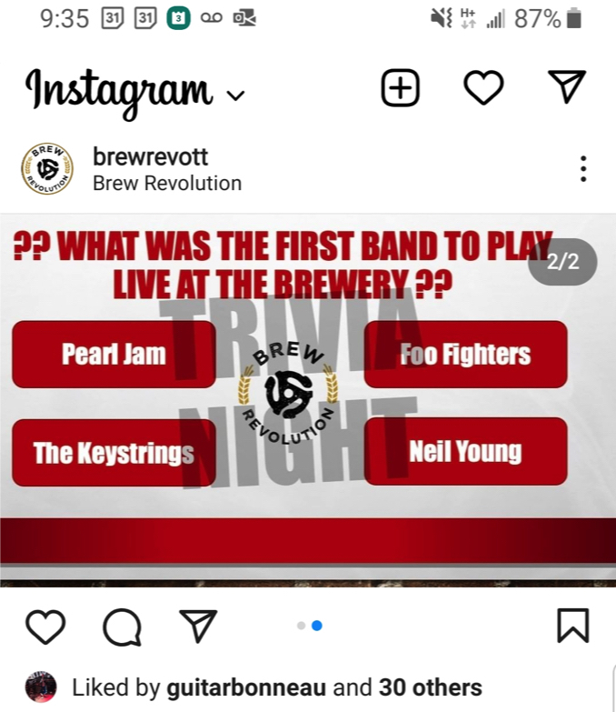 I didn’t even know this was on our bands bucket list, but we are so humbled to have been included as a trivia question by Brew Revolution. Most people got it right, so we popped in after the Pearl Jam concert and hosted a stripped down set featuring a few Peal Jam songs. I’ll tell ya, that was a great sing a long night!