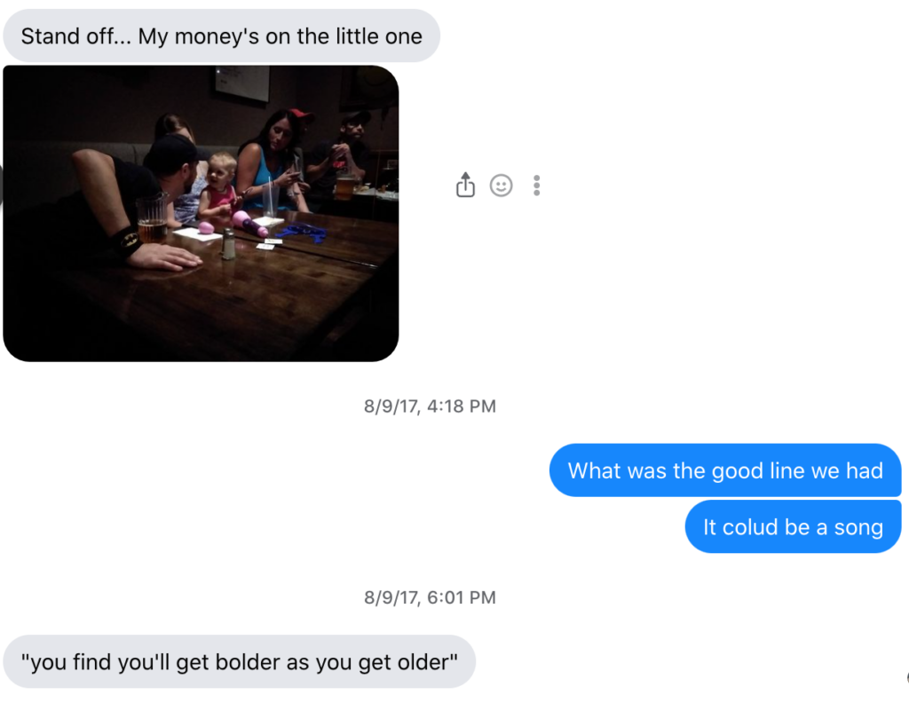 An entire song written off of a fun moment and a text exchange. This photo was sent to me the morning after another fun gig, with the caption “My money is on the little one”. As I put pen to paper, I needed a more robust theme for the song and broke it down to arguing with a child, only to realize half way through that they are in fact correct and you are wrong. This mixed with the point of view of someone else realizing what is happening.